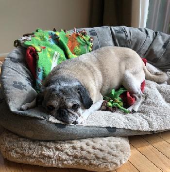 Sophie was surrendered to the rescue in 2017, she was 7 years old. She went through a very difficult back surgery to have cyst removed from her spine. She had multiple MRI's, several vet visits and years of physical therapy. She was our first foster that went through water treadmill therapy! In addition to her weekly visits to PT, we set up PT exercises for her at home, which she did on a regular basis. All through her physical challenges she was quite the sassy pug! She kept all of her foster brothers in order and was quite vocal with everyone when she wanted or needed something or was just annoyed by those around her. She was a true gift to us and we're grateful to be able to continue her care as she became a permanent foster with the rescue. In her later years her myelopathy progressed and ultimately had very little use of her hind legs. This did not deter her sassy spirit, if anything she became more of a "pug princess"! We carried her all throughout the house and we got her a stroller for various outings and vacations! Sophie sadly passed on December 23rd, 2025, just a few weeks shy of her 16th birthday. She will be missed but will always have a special place in our home and hearts. Sharlene & Kyle